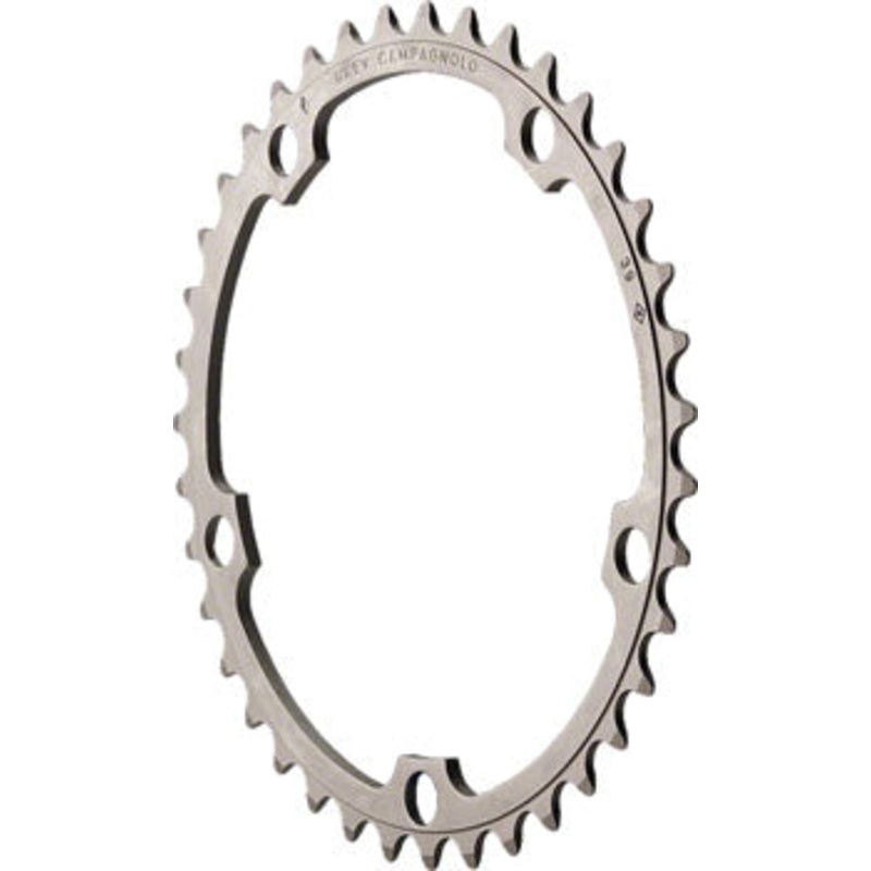 Campagnolo 8/9/10-Speed 39t Chainring AFT Finish. Campagnolo 135mm Double Inner Chainring TECH SPECSColor AFT Matte-greyRing Position/Type InnerTooth Count 39Drivetrain Speeds 10Drivetrain Speeds 9Drivetrain Speeds 8Chainring BCD 135Material AluminumDefine